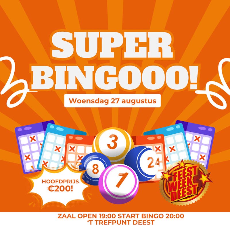 Op woensdag 20 augustus trappen we de Feestweek af met onze altijd gezellige superbingo!! Onze hoofdprijs is maar liefst €200 maar er zijn nog wel meer leuke prijzen te winnen! Zien we jou dan in T' Trefpunt? De zaal opent om 19:00 en we starten om 20:00!