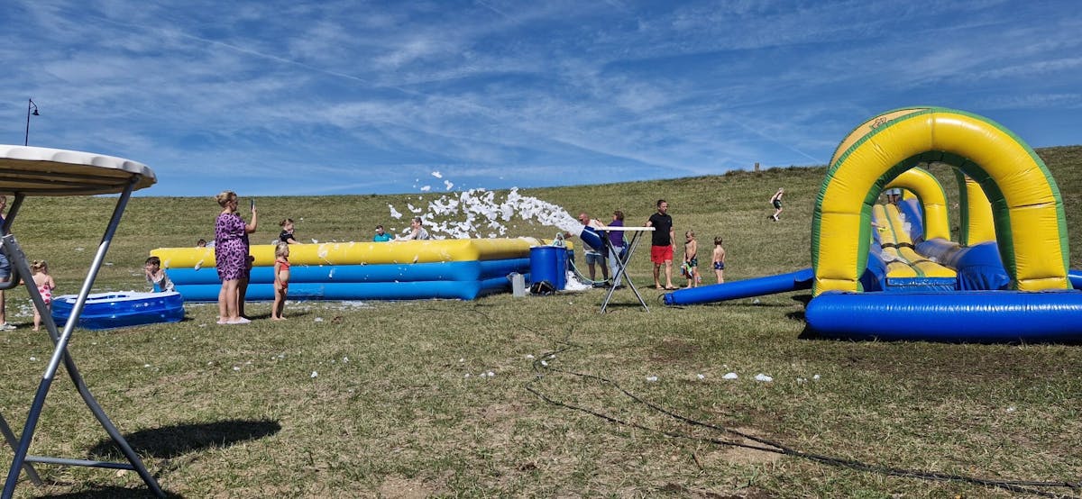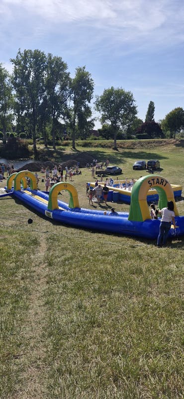 Er stond een buikschuifbaan met extra snelheid omdat deze vanaf de dijk ging en een er stond een mega groot schuimbad.