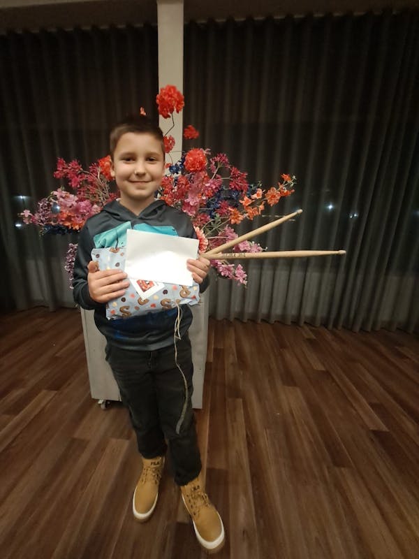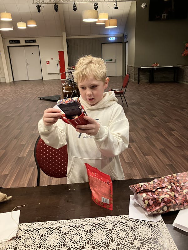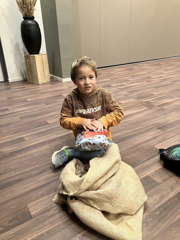 Er was een zak met cadeautjes afgegeven waar de drie jongste kinderen erg blij mee waren. Samen met docent Merel hebben ze de cadeautjes uitgepakt en het gedicht voorgelezen.